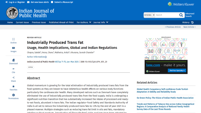 Industrially Produced Trans Fat; Usage, Health Implications, Global and Indian Regulations